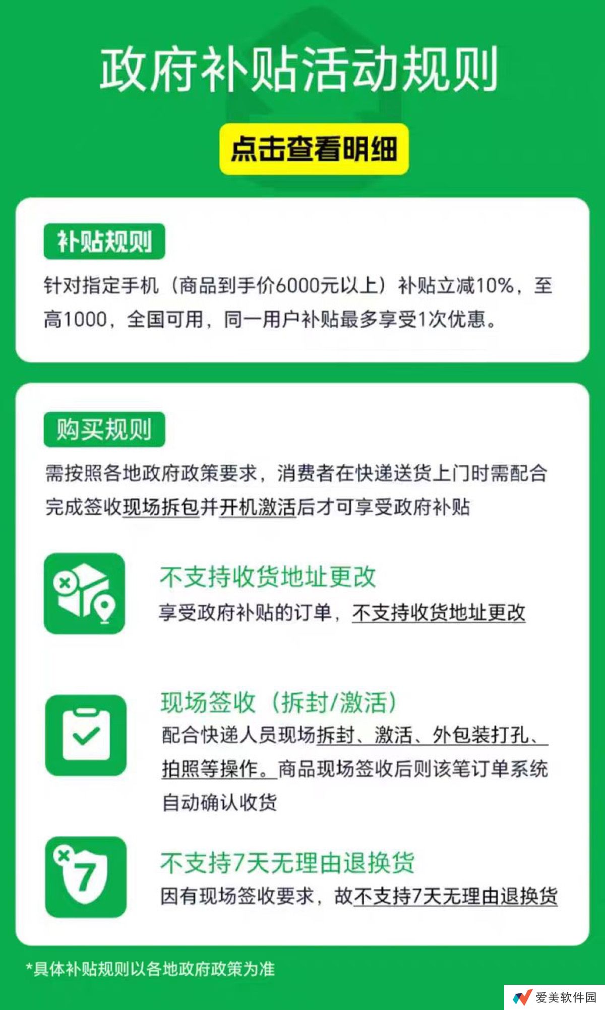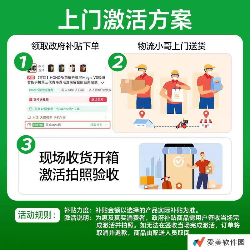 需按照各地**政策要求,消费者在快递送货上门时需配合完成签收现场拆包并开机激活后才可享受**补贴。