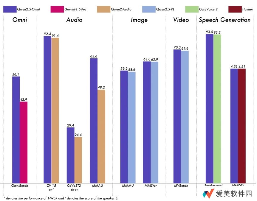 全模态性能优势:在同等规模的单模态模型进行基准测试时,表现出卓越的性能。Qwen2.5-Omni 在音频能力上优于类似大小的 Qwen2-Audio,并与 Qwen2.5-VL-7B 保持同等水平。