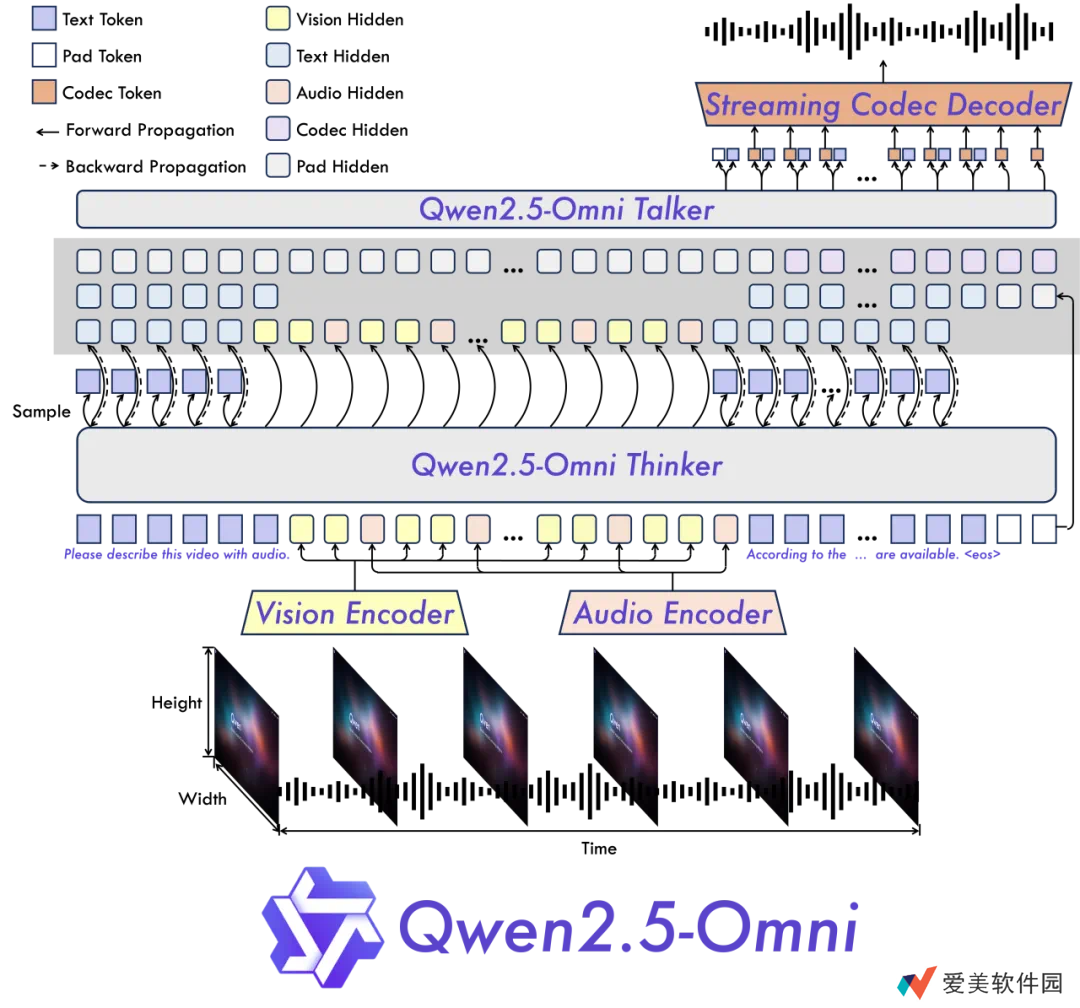 全能创新架构:Qwen 团队提出了一种全新的 Thinker-Talker 架构,这是一种端到端的多模态模型,旨在支持文本 / 图像 / 音频 / 视频的跨模态理解,同时以流式方式生成文本和自然语音响应。Qwen 提出了一种新的位置编码技术,称为 TMRoPE(Time-aligned Multimodal RoPE),通过时间轴对齐实现视频与音频输入的精准同步。