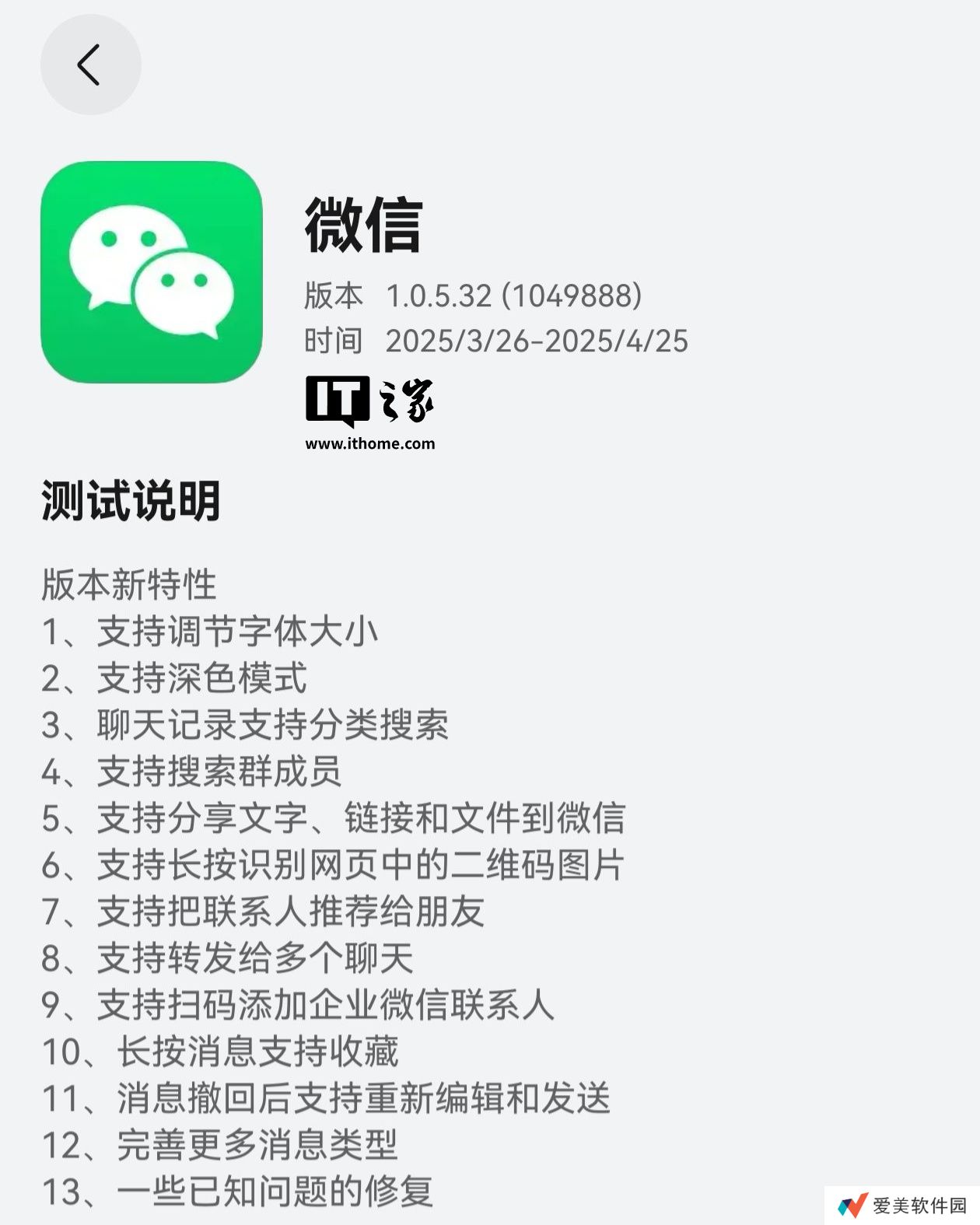 本站 3 月 27 日消息,微信鸿蒙版 App 昨日晚在华为应用市场(App Gallery)开启 1.0.5.32(1049888)版本邀测升级(需收到短信通知后点击链接跳转安装,未收到短信需继续等待),测试时间为 2025/3/26 - 2025/4/25。