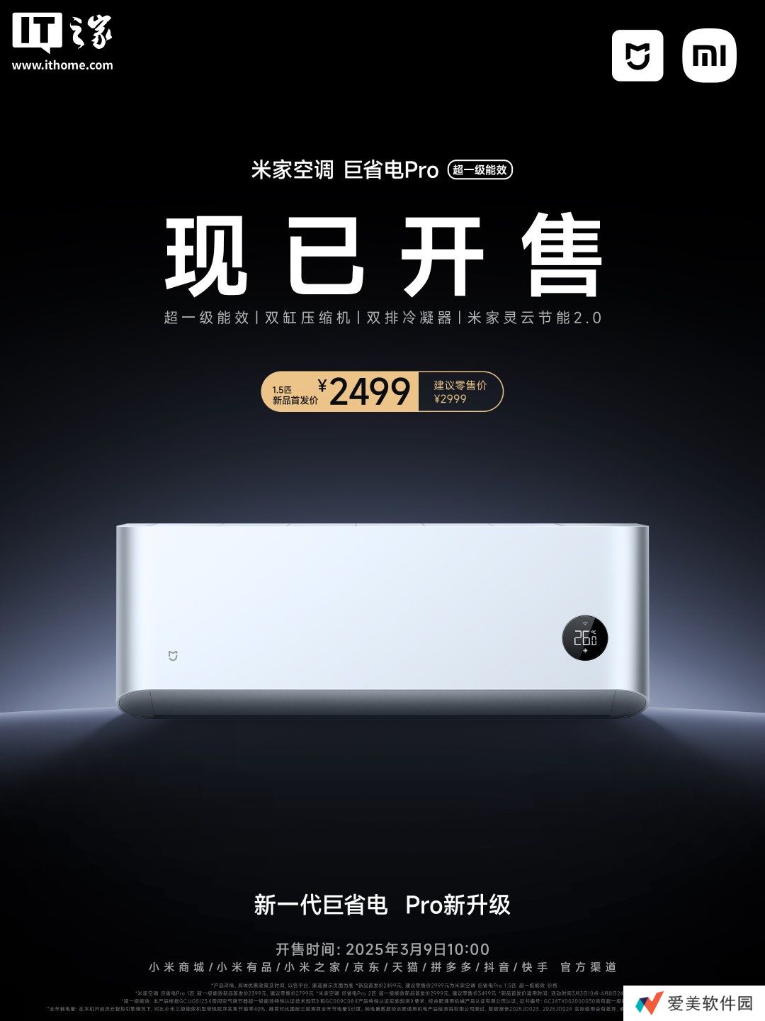 小米米家空调巨省电 Pro 2025 款 3 月 9 日正式开售,支持超一级能效,1.5 匹建议零售价 2999 元,首发价 2499 元。