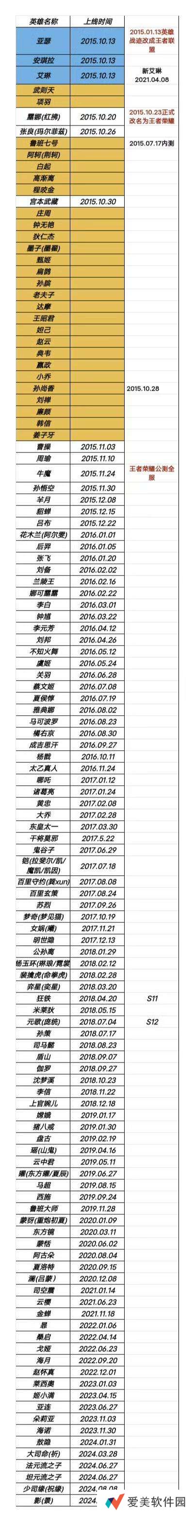 网友整理王者英雄上线时间,你玩王者时哪个英雄刚出?