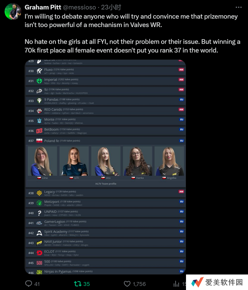 而如果今天是Major邀请日,那么Poland fe将凭借37名的位次直接受邀参加欧洲RMR 封闭预选赛。也正因此,messioso认为V社排名中奖金权重过大,并不合理。