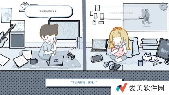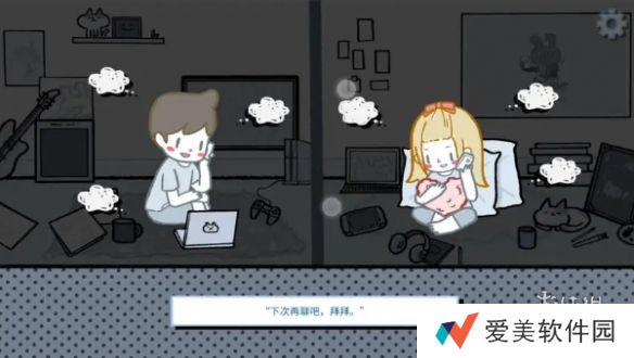 8、进入下一个场景中点两个人共同有的东西游戏机、手柄、吉他、耳机和两只猫咪。拉近手机屏幕,把屏幕拉黑出现三朵白云。