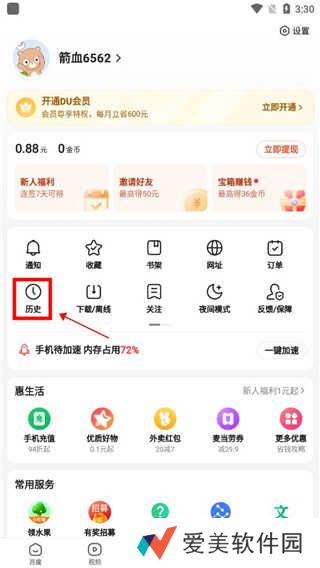 2、在我的页面中点击历史功能;