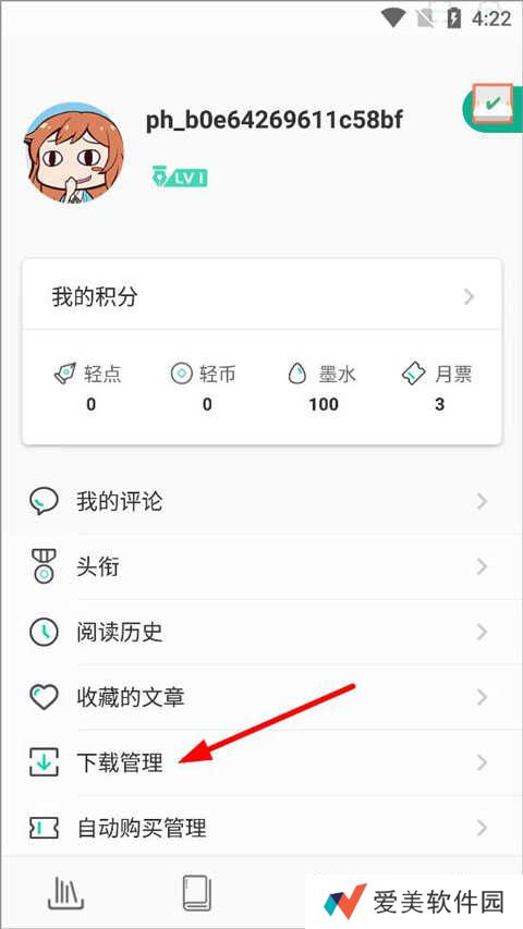 6、文章下载后可打开个人中心页面,用户可查看阅读历史、收藏文章等,点击下载管理;