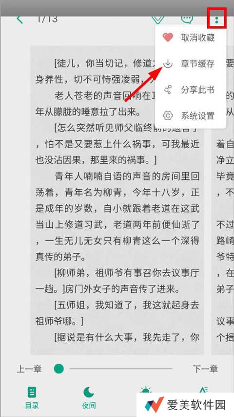 5、也可进入正文页面,单击屏幕,点击右上角“...”,下拉选择章节缓存;