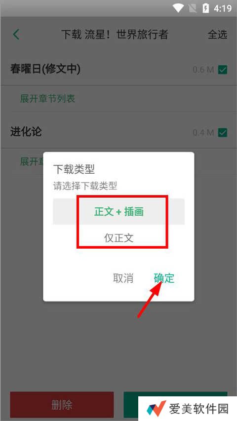 4、选择下载类型(正文+插画、伪正文),点击确定;