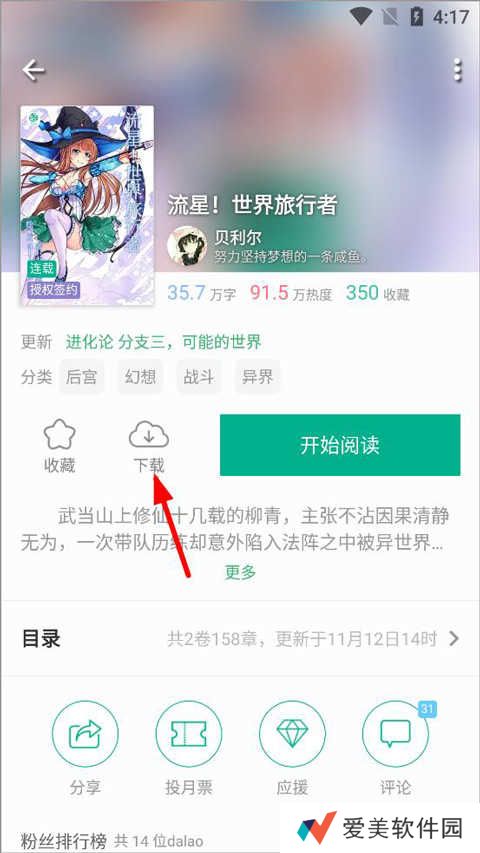 2、进入小说主页面,用户可收藏、阅读、分享、评论小说,点击阅读键旁边的下载按钮;