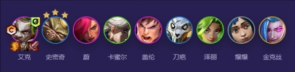 集结艾克、史密奇、蔚、卡蜜尔、盖伦、刀疤、泽丽、爆爆、金克丝等英雄。