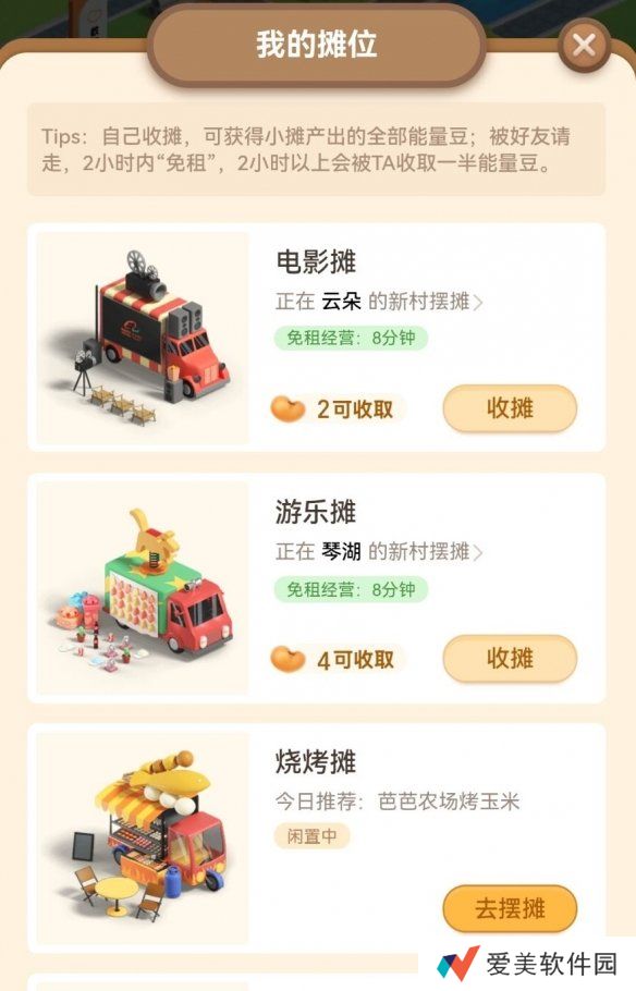 在小摊开始摆摊的一定时间内为“免租”经营摆摊状态,新村“村长”可以在该状态下请走小摊 ,但新村“村长”不能收取该小摊产生的能量豆,具体“免租”经营时间见页面提示。