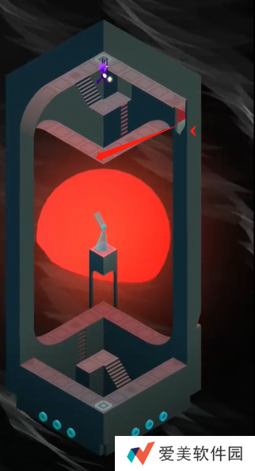 2、到达下方红**域后,继续旋转机关,让角色踩到右侧的机关上。