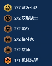 7蓝发、2双形、2哨兵、2格斗、2法师、1机械先驱