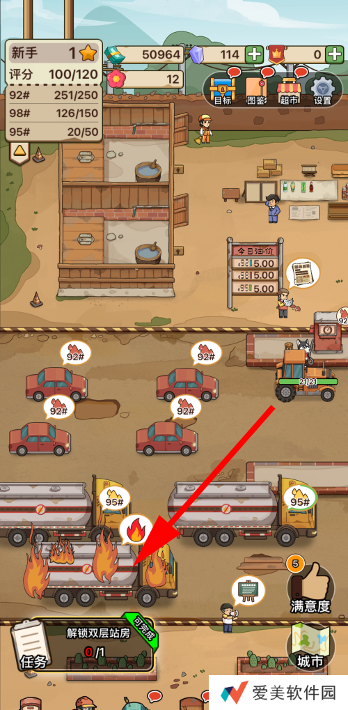 1、首先,请直接进入游戏的欢迎界面,并点击屏幕底部那辆正处于火警状态的油罐车。