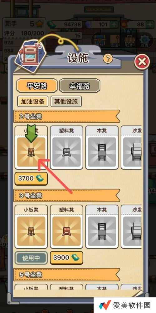 2、在“设施”界面中,选取“加油”部分,你便能发现“小板凳”这一道具。