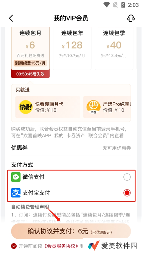 2、在我的会员页面中选择vip会员套餐,选择支付方式,点击立即支付按钮。