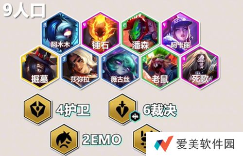 一、阵容组成最终9人口:阿木木、锤石、潘森、阿卡丽、掘墓、莎弥拉、薇古丝、老鼠、死歌。8人口锁血:阿木木、锤石、潘森、阿卡丽、莎弥拉、薇古丝、老鼠、死歌(上六裁决,战力立马就上来了)7人口过度:阿木木、锤石、潘森、莎弥拉、薇古丝、老鼠、妮蔻(组四护卫)