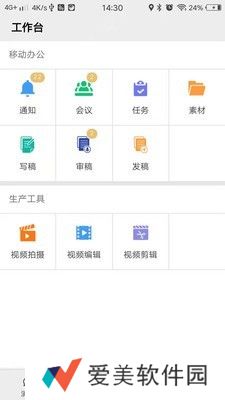工作台可以查看自己收到的通知,会议,任务,可以查看自己上传的素材,还可以移动写稿,移动审稿,移动发稿。