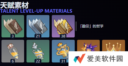 提升为10级:勤劳的哲学*16、原素花蜜*12、新周本材料*2、智识之冕、700000摩拉