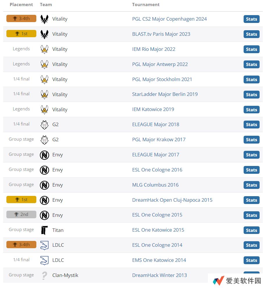 作为CS常青树,apEX三入Major决赛,并且拿到了两次冠军。同时值得一提的是,他和ZywOo组合在Major拿下的最差成绩为传奇组,分别是2022年的里约Major、2022年的安特卫普Major和2019年的柏林Major。