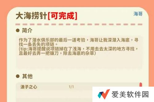 2、之后需要潜入海底,要带好氧气瓶再进入海底。3、进入海底之后沿着阶梯的边缘向下走,有三个阶梯。4、第三个阶梯处会有黄色珊瑚,然后沿着黄色珊瑚下去阶梯。5、到了下面就可以看到浪子之心,点击浪子之心就能拿到了。6、拿到浪子之心后交给海哥,然后玩家就可以加入潜水俱乐部了。