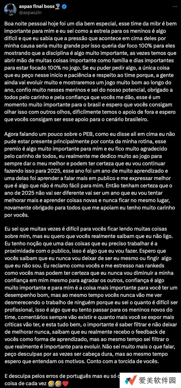 我知道,很多时候你们读到关于我的各种消息会感到不舒服,但我希望你们真的能明白,我并不在意。我清楚自己需要改进的一点是与大家的互动,这是我将努力去做的。我希望你们知道,我永远不会改变自己或假装成什么样的人。我会像你们一样在排位赛中抱怨、发脾气,但请相信,我绝不会为了取悦别人而降低对自己的信心。自信对我来说非常重要,也是取得好成绩的关键。但与此同时,你们也永远不会看到我贬低任何人的努力,因为我知道成为一名职业选手有多么不容易。这也是我一直试图传达给队里新人的理念。评论总是会存在的,而且曝光度越高,批评就越多,这没关系,重要的是懂得筛选,并且永不停止进步。请相信,我确实会把你们的反馈当作学习的方式,但与此同时,我也知道如何过滤出真正对我成长有帮助的内容。我也不知道还能说什么了,如果有时我显得固执,请原谅我,但同时也希望你们能理解原因。我需要你们的支持。
