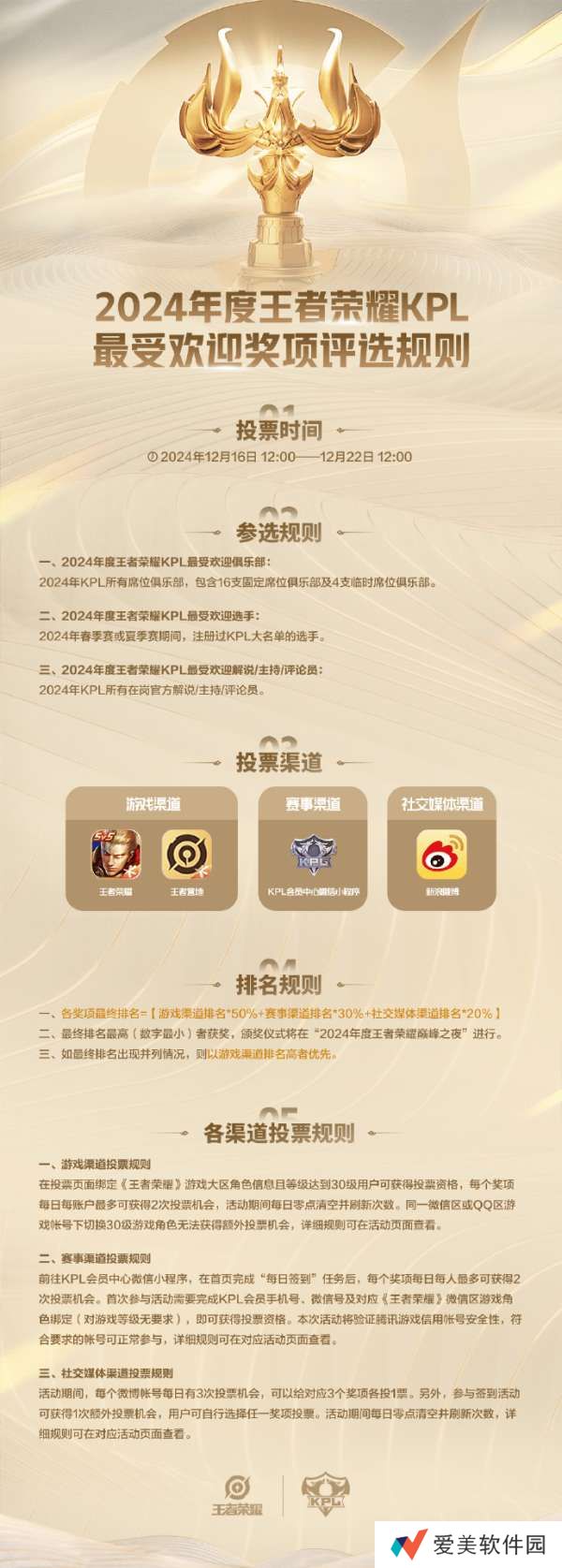 各奖项最终排名=游戏渠道排名*50%+赛事渠道排名*30%+社交媒体渠道排名*20%,最终排名最高(数字最小)者获奖,颁奖仪式将在“2024年度王者荣耀巅峰之夜”进行。