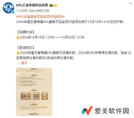 2024年度王者荣耀KPL最受欢迎奖项评选活动将于12月16日12:00正式开启!