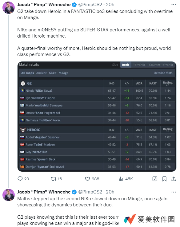“G2凭借在Mirage加时赛的精彩表现击败了HEROIC。NiKo和m0NESY以超级明星的表现,最终在BO3比赛中战胜了训练有素,执行力如同机器一般的HEROIC。