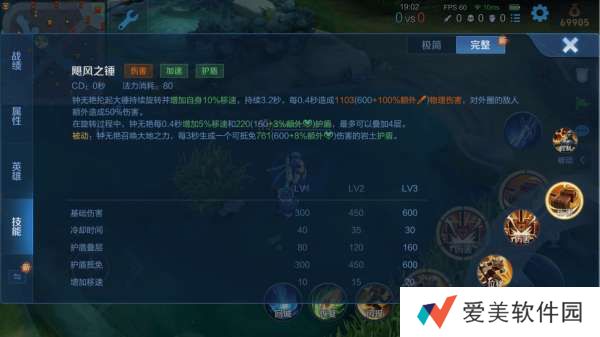 三技能叫作飓风之锤,这一招就像转呼啦圈,一边旋转一边攻击,一边提升自身移速,一边还能叠加4层护盾。