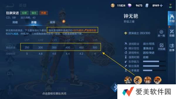 这里面有两个关键点,一是重击的基础伤害不算高,但有50%的额外AD加成,攻击力越高重击伤害越高,满级六神装的钟无艳,仅一个强化重击的伤害,就能超过700点。