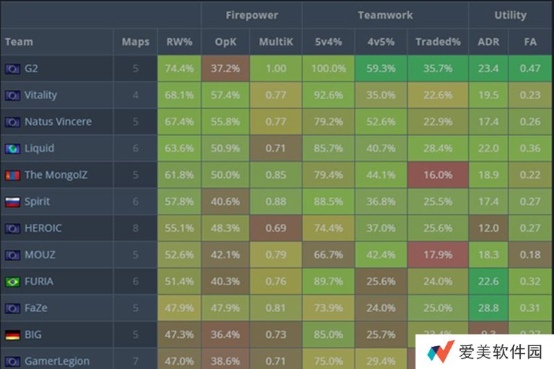 而从队伍的攻守双方数据看,G2战队在进攻方的表现有了天差地别的变化。他们是正赛阶段进攻方回合胜率最高的战队,达到了74.4%。
