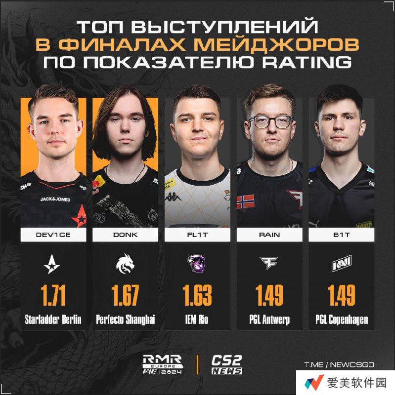 Astralis四冠伟业的奠基者,狙击手device。他曾在2019年StarLadder 柏林Major总决赛中打出1.71 rating,是目前为止Major历史上总决赛rating最高选手。donk则是位列榜单第二名。