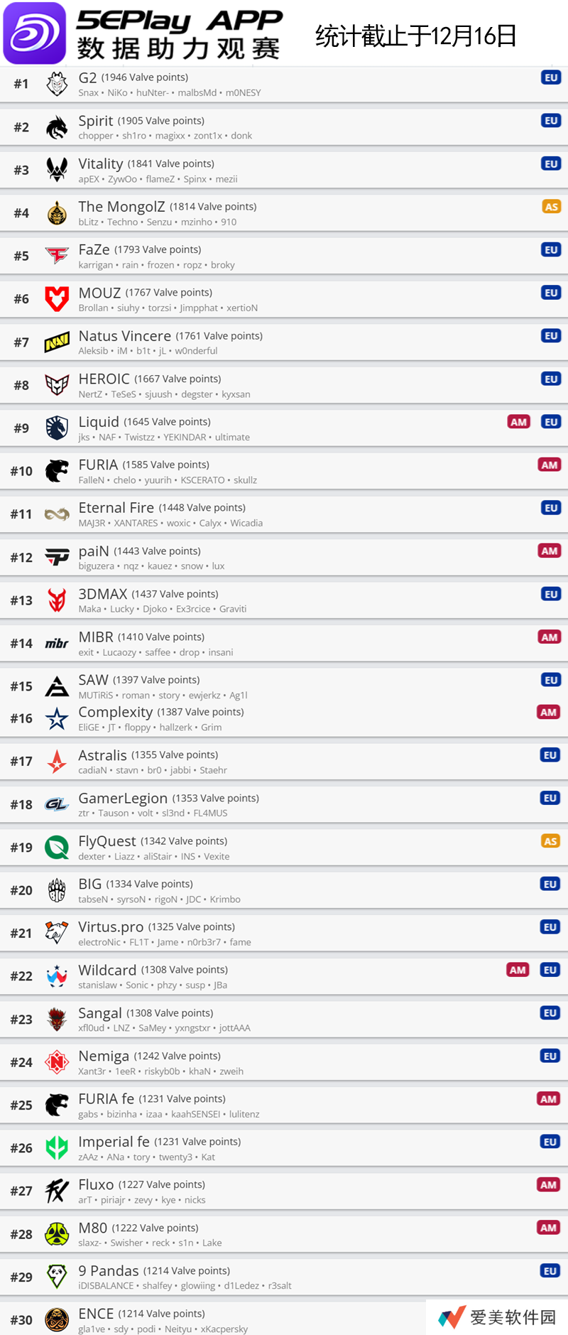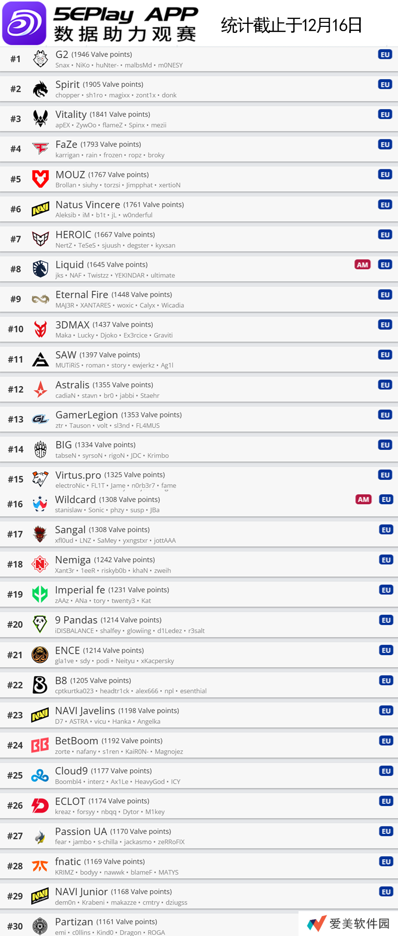 欧洲区前30名如下: