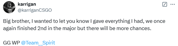 Spirit战队后,karrigan也是难掩悲痛,流下泪水,赛后动态中向哥哥表达了遗憾:“哥哥,我想让你知道,我已经竭尽全力了,我们又一次倒在了总决赛,但我们会有更多机会。”