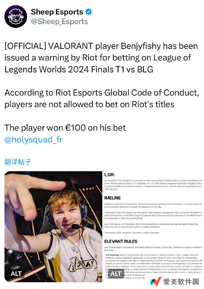 2024年11月4日,Team Heretics的管理层向拳头游戏报告,Benjyfishy在2024年11月2日举行的英雄联盟全球总决赛(T1对阵BLG)中**,并赢得了100欧元奖金。