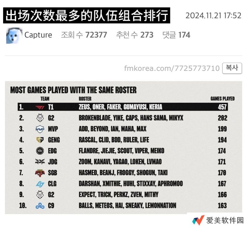 直播吧11月22日讯 近日T1官宣上单Zeus离队,这也代表着T1的五人组合ZOFGK时代的结束。同时他们也是历史上出场次数最多的五人组合,出场次数高达457场;要远高于G2阵容的202场。