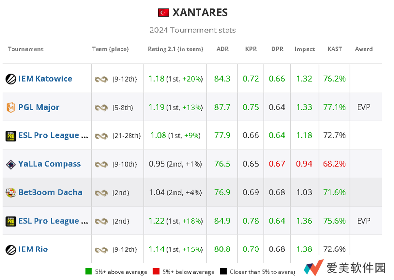 今年29岁的XANTARES终于进入TOP20选手行列,这要归功于他在与顶级选手的较量中取得的优异成绩,他在今年的大赛中取得了1.17 Rating(TOP4),在著名赛事中与TOP20对手的较量中取得了1.16 Rating(TOP6)。