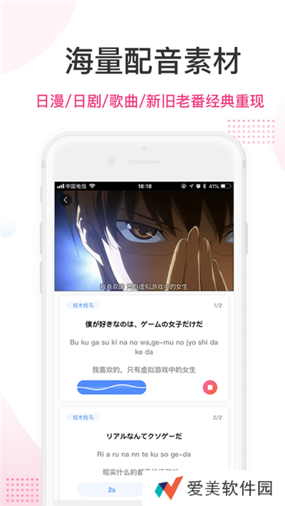 这里为用户提供了配音学日语的方式,可以通过配音去练习纠正自己的口音问题。《羊驼日语》非常实用的日语学习软件,精选了海量的日漫、日剧、歌曲等资源,发音上打好坚实基础。