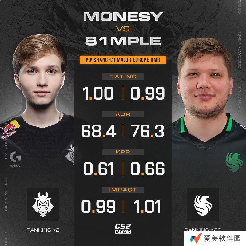 G2战队以3-1的战绩顺利晋级上海Major正赛后,有外媒统计对比了在本次欧洲RMR中m0NESY与s1mple二人的数据表现。