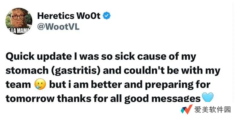 WOOT在社交媒体上向粉丝说明情况,表示自己因健康问题缺席比赛,并对队伍的努力表示支持,同时感谢大家的鼓励。他透露自己正在康复中,并准备迎接接下来的比赛。