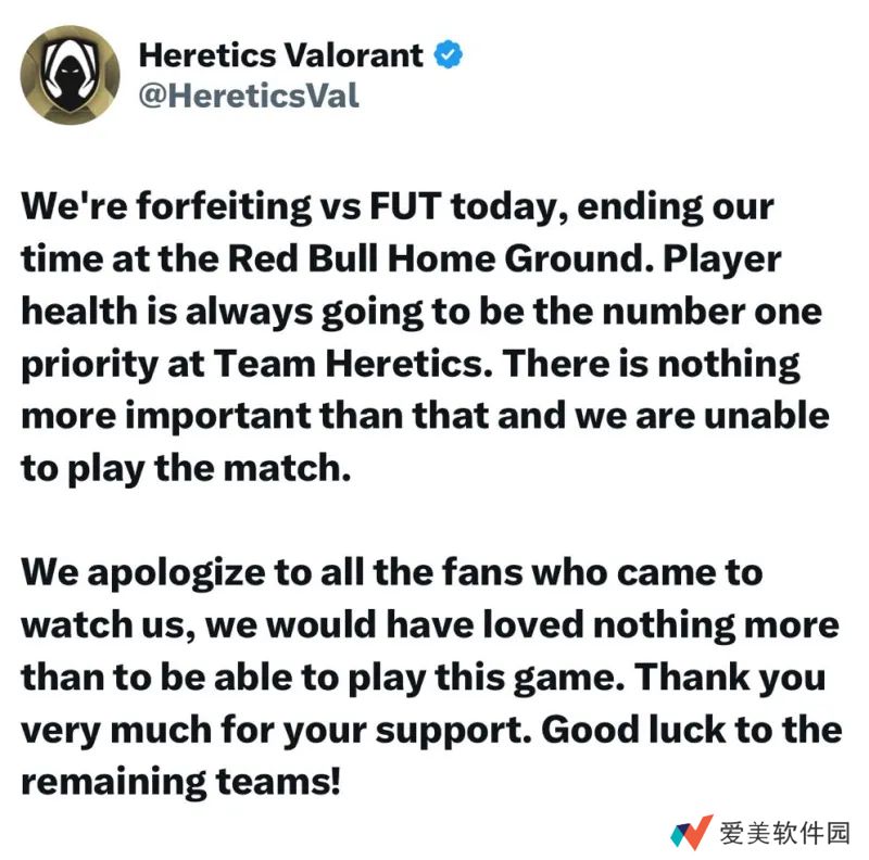 然而,由于队伍整体状况不佳,Heretics在次日宣布退出与FUT的比赛。战队官方表示,“选手的健康始终是Heretics的首要任务”,出于对选手身体状况的考量,他们无法完成本场比赛,并感谢所有支持他们的粉丝。战队也向剩余参赛队伍表达了祝愿。