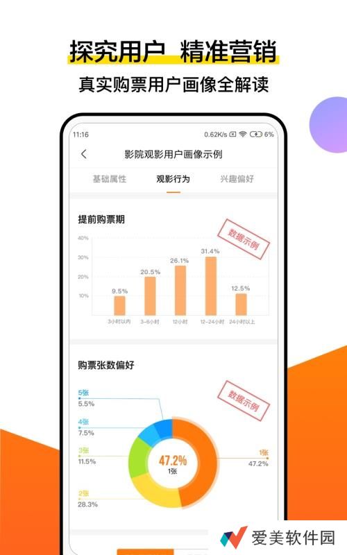 6、影院实时票房/用户画像数据:实时影院票房查询,确定竞对影院,制定经营决策; 借助阿里大数据洞悉影院周边和购票人群,更了解影院潜在观众;