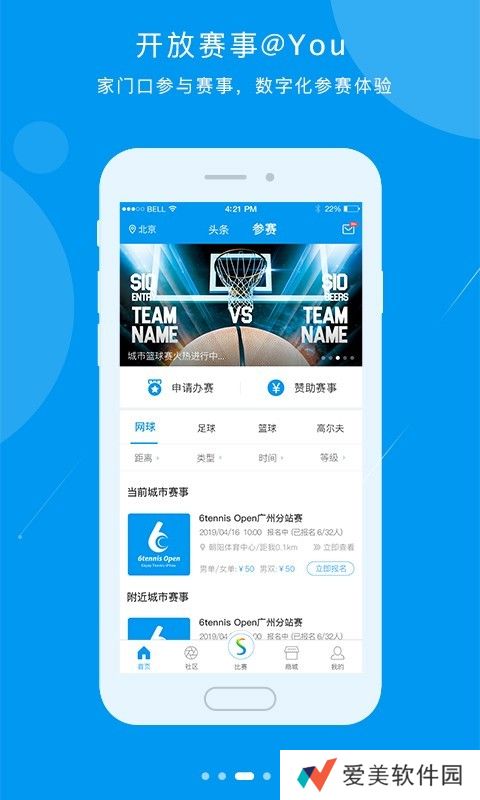 【开放赛事@You】在线报名,在家门口就能参加体育赛事;数字化参赛体验,全方位记录运动生涯;跟进赛事的深度报道,给你一球成名的机会;统筹全局的积分体系,还有丰厚奖品等着你!覆盖全国各个城市的易赛赛事,便是为你量身打造的全开放综合体育舞台。(后期赛事不断拓展可改为“易赛赛事”)