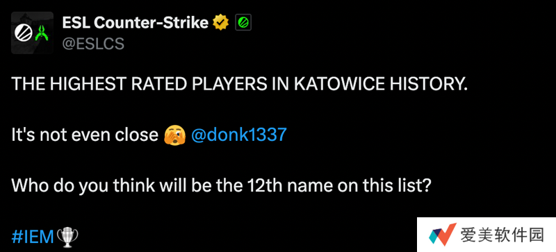 在IEM 卡托维兹 2025比赛开始前,赛事主办方ESL回顾了自2014年以来历届卡托维兹赛事中的佼佼者(rating最高选手)。其中,donk以1.70 rating断层领先,排名第二的是被donk打破卡托维兹rating最高记录的NiKo,当时效力于