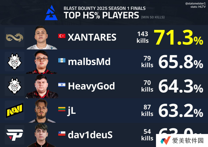 XANTARES在143个人头中有71.3%的击杀为爆头击杀,荣获爆头机器称号。malbsMd的爆头率为65.8%。HeavyGod第三,爆头率为64.3%。