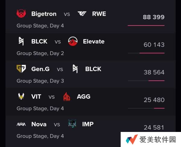 同时,洲际邀请赛S3小组赛最高观赛人数为88399,大幅超过去年同期KIS1的46736观看人数,观赛人数前五排名具体如下: