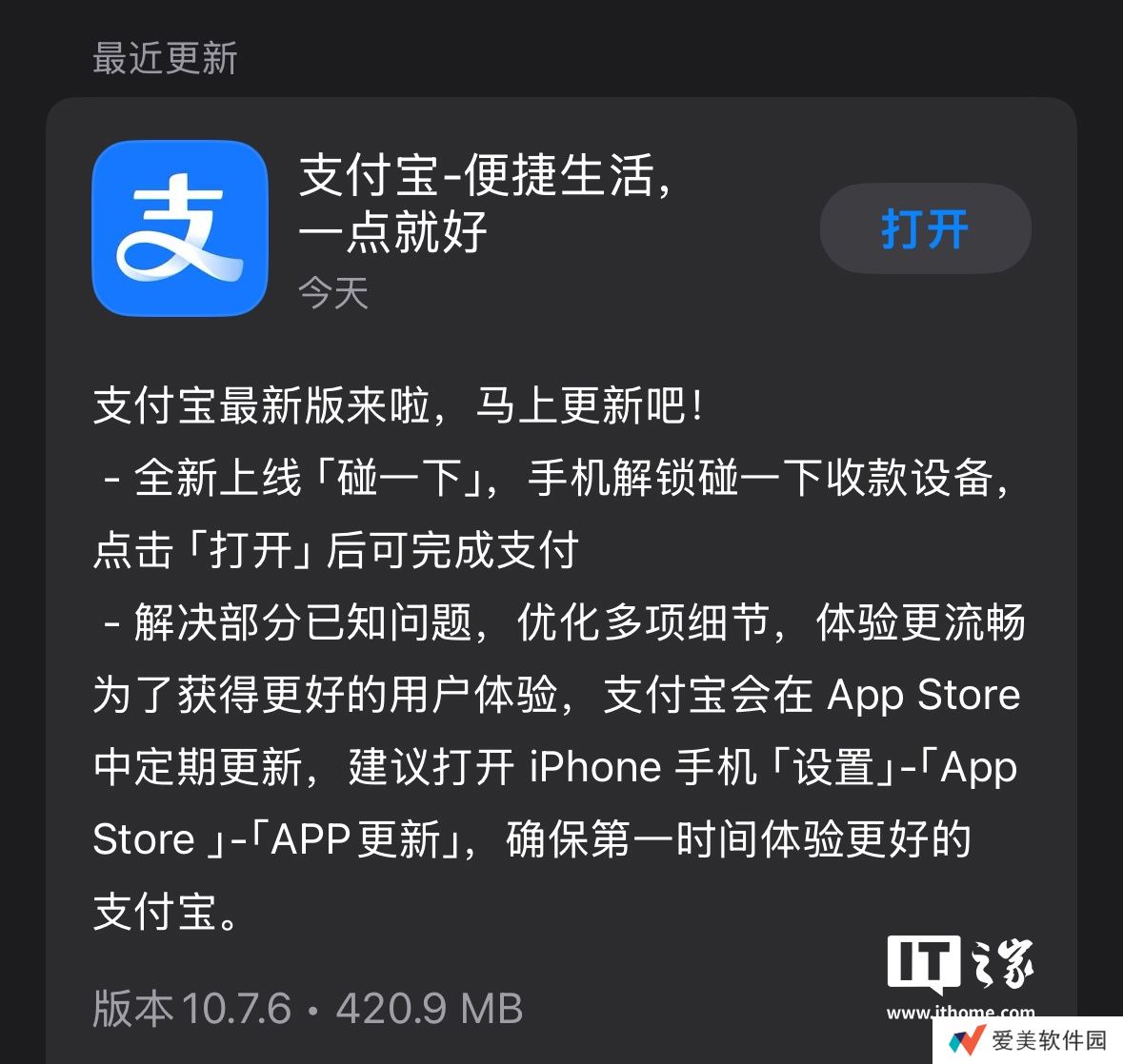 本站 3 月 3 日消息,综合读者反馈并经本站测试,苹果iOS版“支付宝”客户端今天更新的10.7.6版本中悄悄适配了iOS 18深色模式图标特性(注:官方未在App Store更新日志中提及),用户切换系统主题为深色后,支付宝客户端会自动将图标色调同步为深色风格。