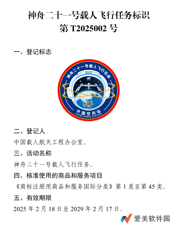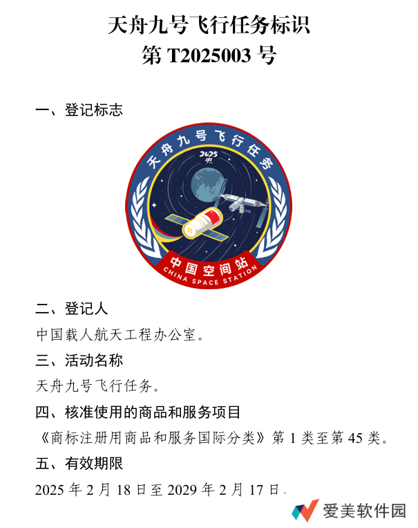 本站 3 月 3 日消息,2 月 28 日,国家知识产权局对中国载人航天工程办公室提交的“神舟二十号载人飞行任务标识”等 3 件特殊标志登记申请予以核准,本站附公告全文如下: