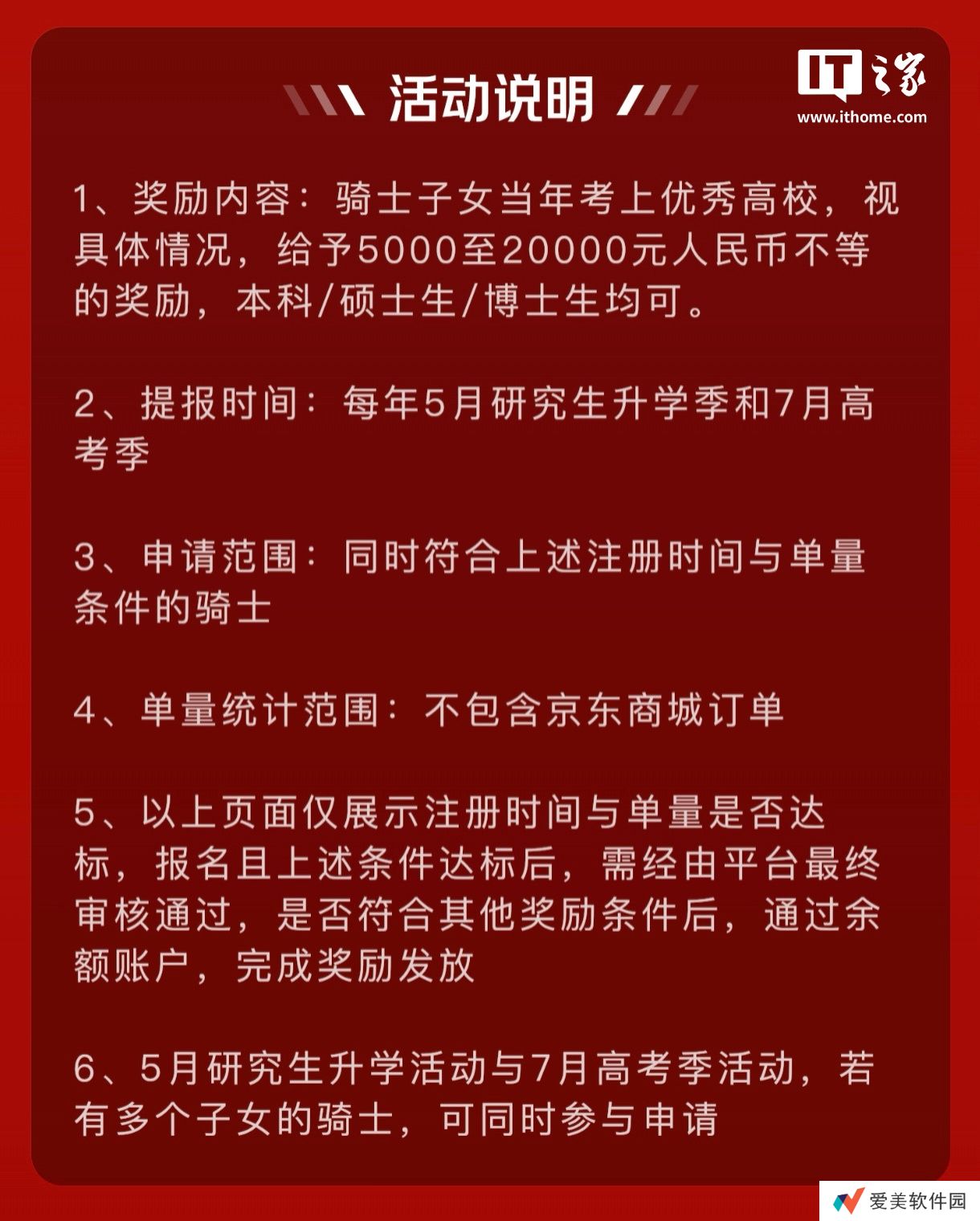 京东秒送表示,5 月研究生升学活动与 7 月高考季活动,若有多个子女的骑手,可以同时参与两项活动申请。